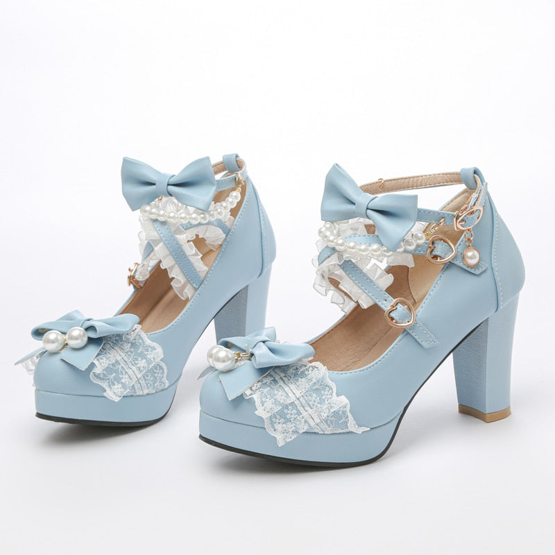 These beautiful shoes may be the frilliest, most girly heels around. You can see the frilly details; the bows, the straps, the pearl charm; that says it all.