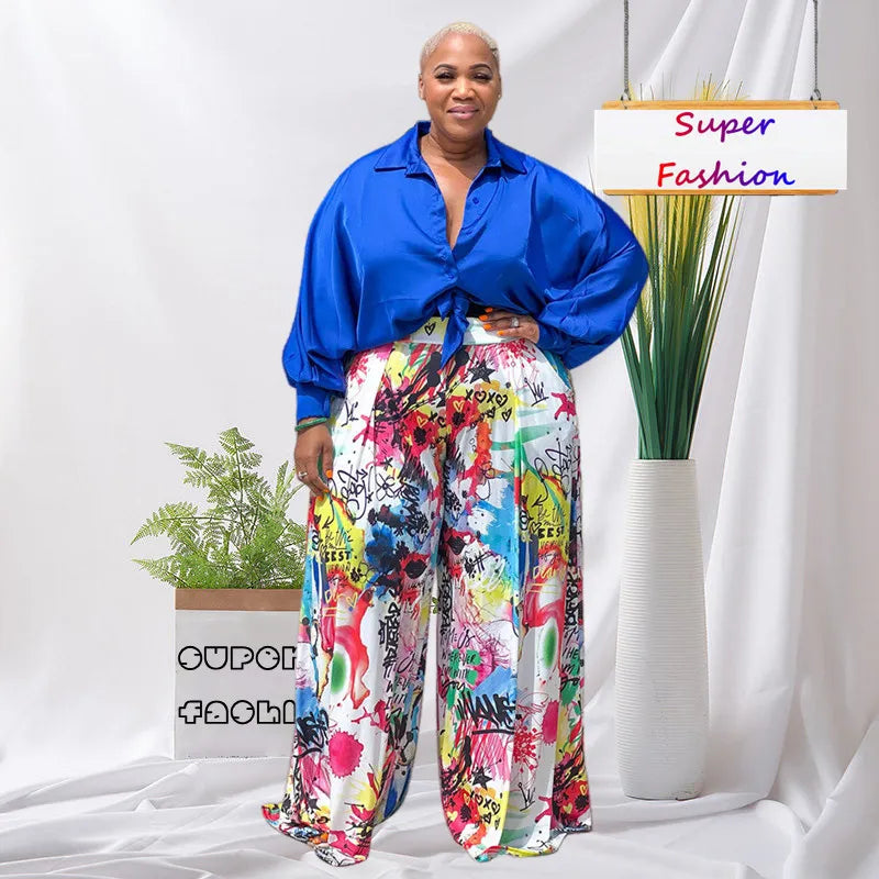 Attributes: Long sleeve lapel shirt with graffiti print wide leg pants