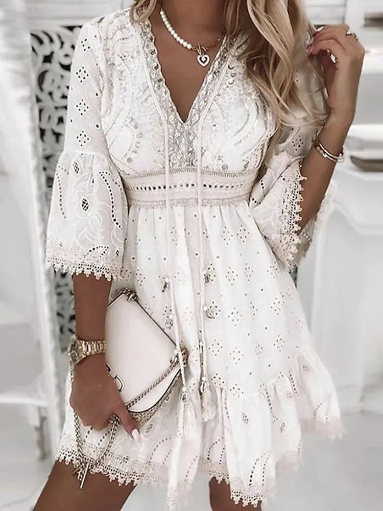 This garment is made of a lightweight and soft fabric that is comfortable and gentle on the skin, making it ideal for spring, summer, and fall. Its casual, loose style offers a breezy and breathable comfort. This cute A-line dress features lace, short sleeves, eyelet, fringe, and a v-neckline, embodying a trendy, bohemian style for summer. For care, it's recommended to either machine wash or hand wash with cold water and avoid bleach.