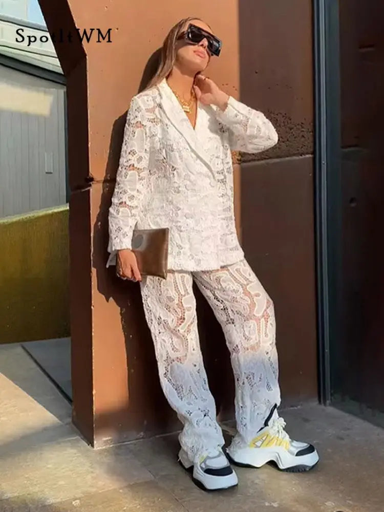 This stylish lace blazer pant suit will make you feel and look your best. It has long sleeves, peak lapels, and buttons up front. The Double Breasted blazer and slacks, crafted from exquisite lace, combine to create a refined yet classic style. You are going to adore this outfit. Purchase your item now, then wear it with confidence.